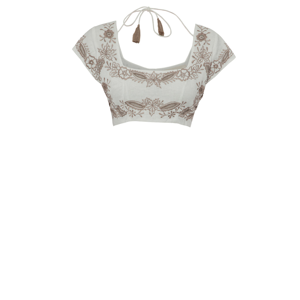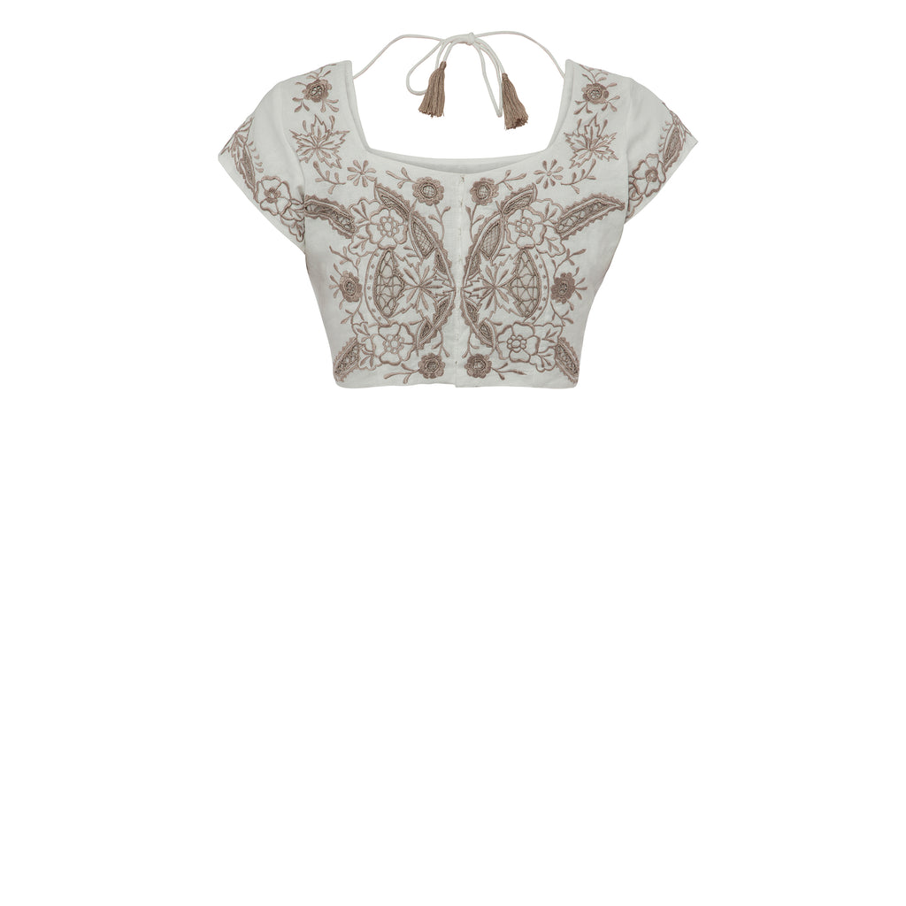 • Heavily embroidery in a neutral stone colour way with detailed hand cut lace work.