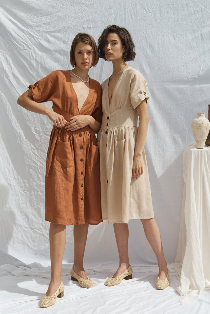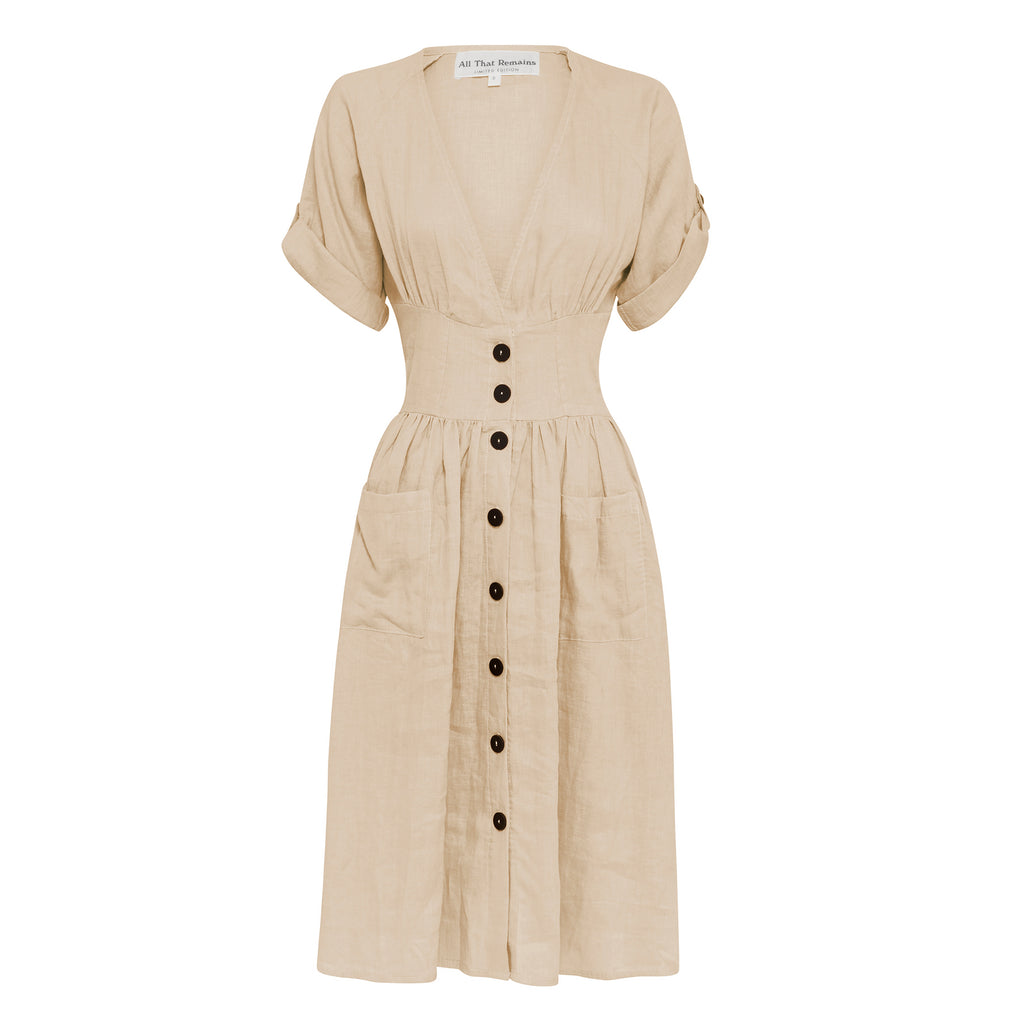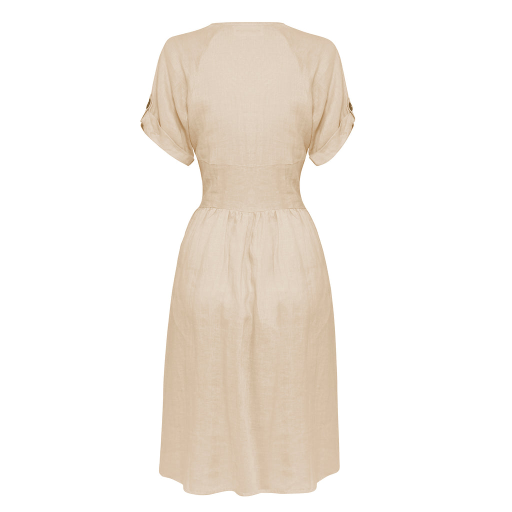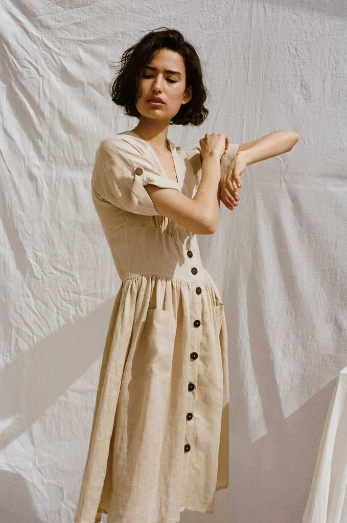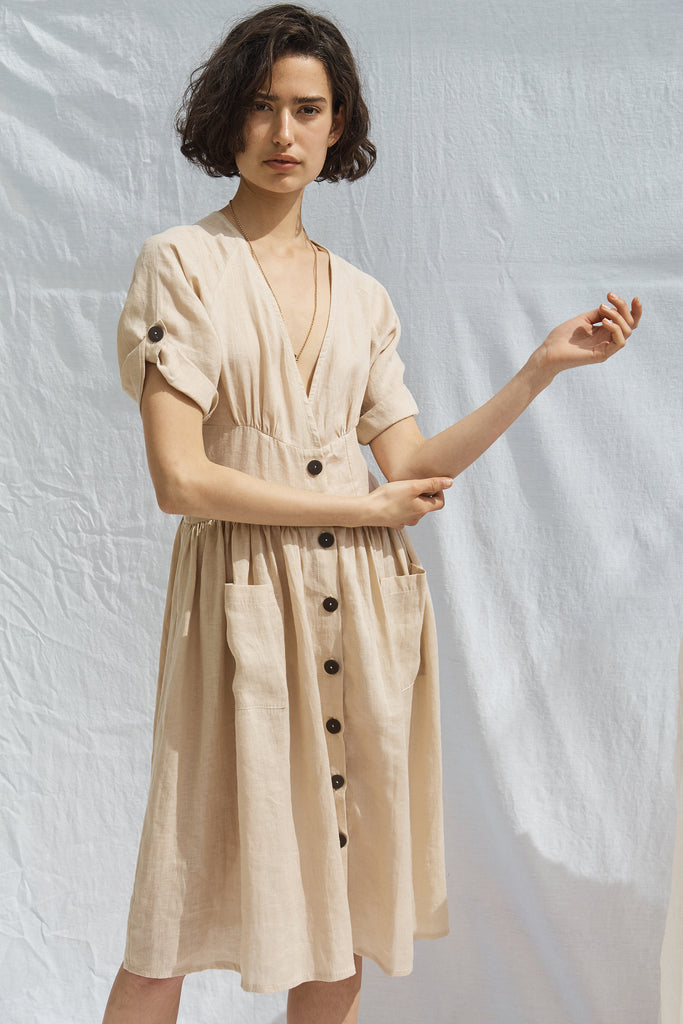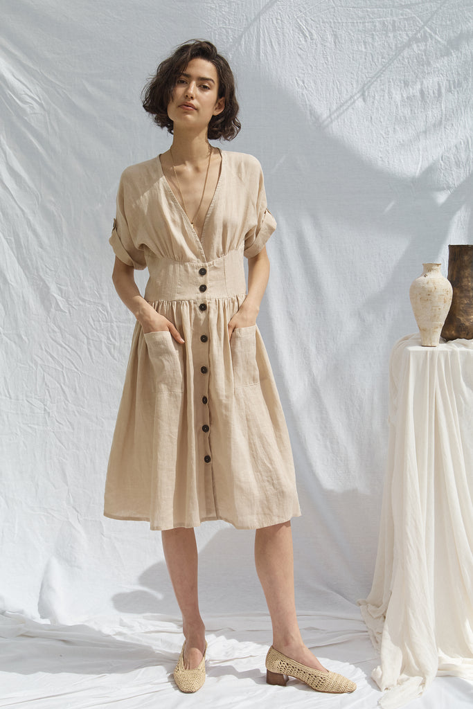 - 3/4 length dress with oversized pockets and a fitted waist.