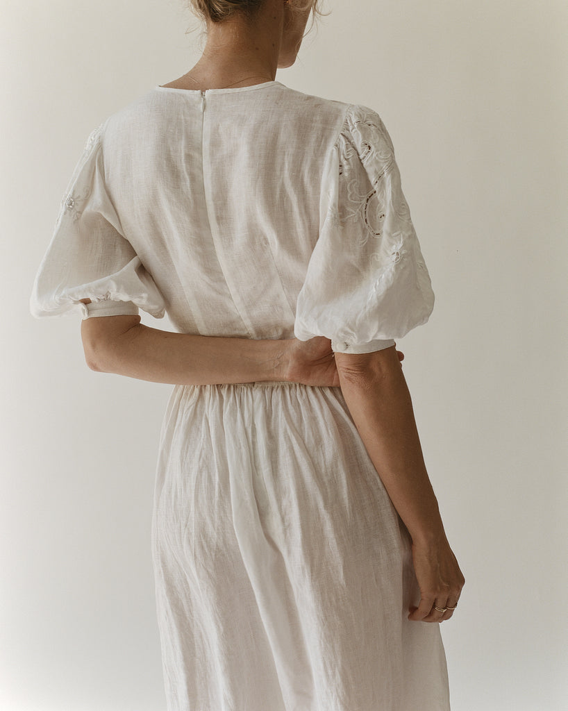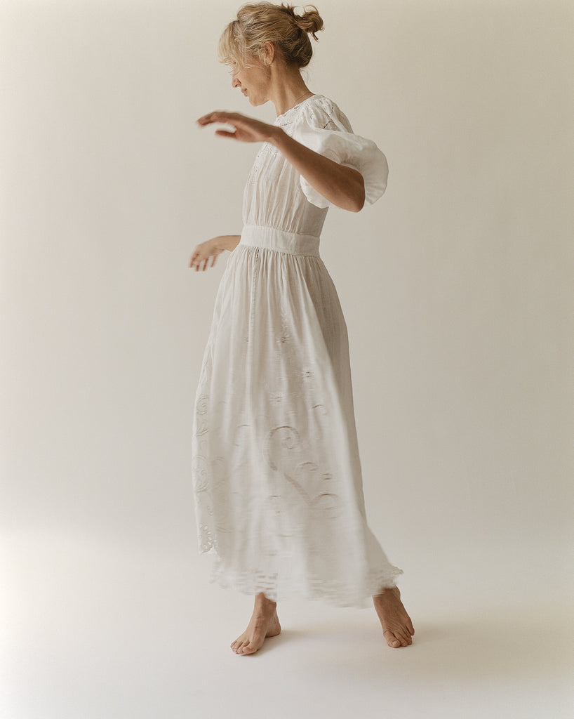 - Floor length, with exaggerated balloon sleeve and delicate cuff.