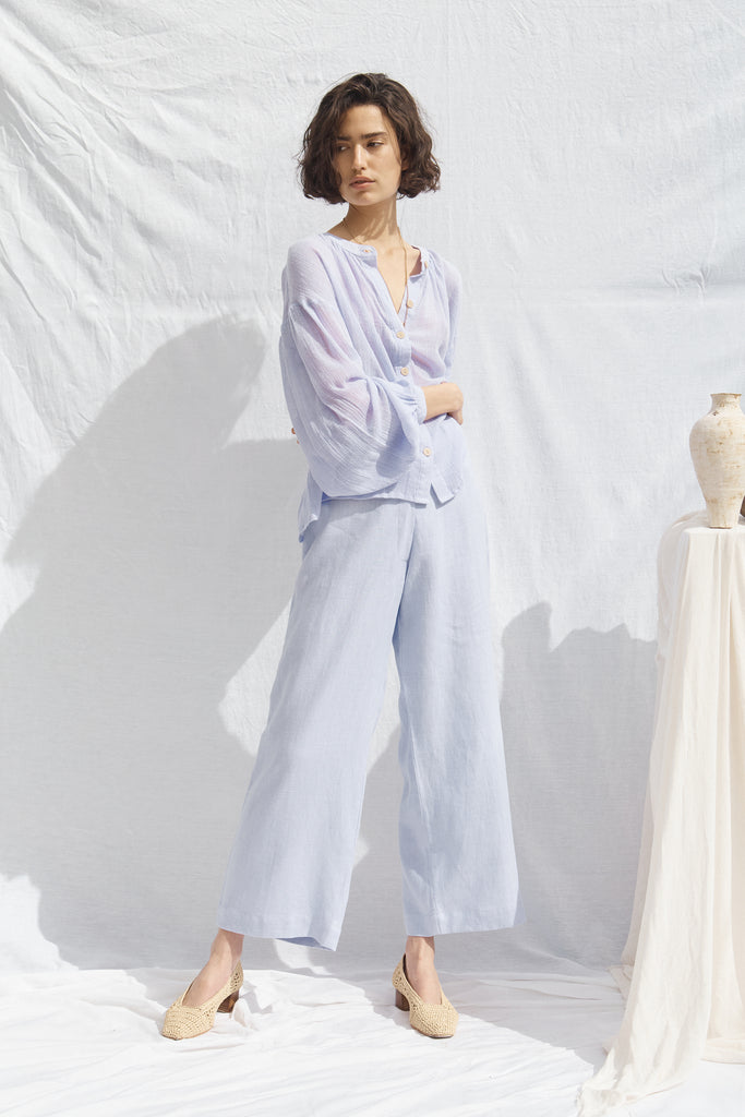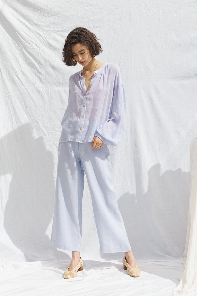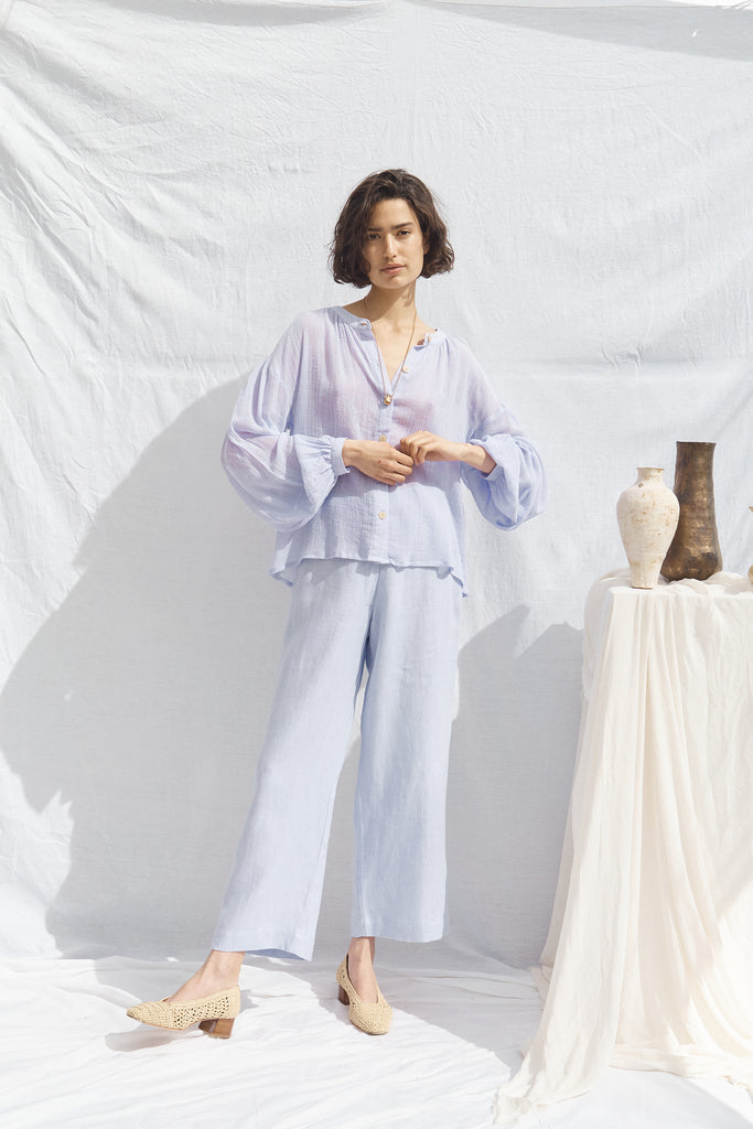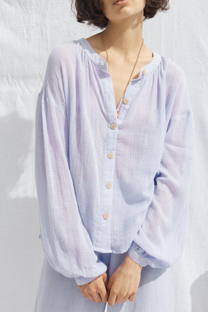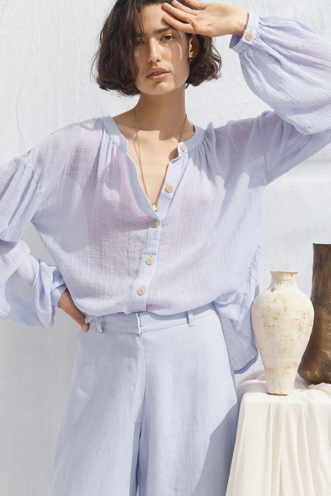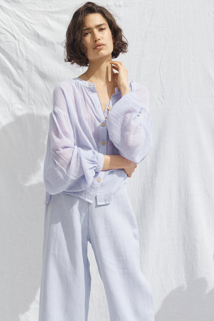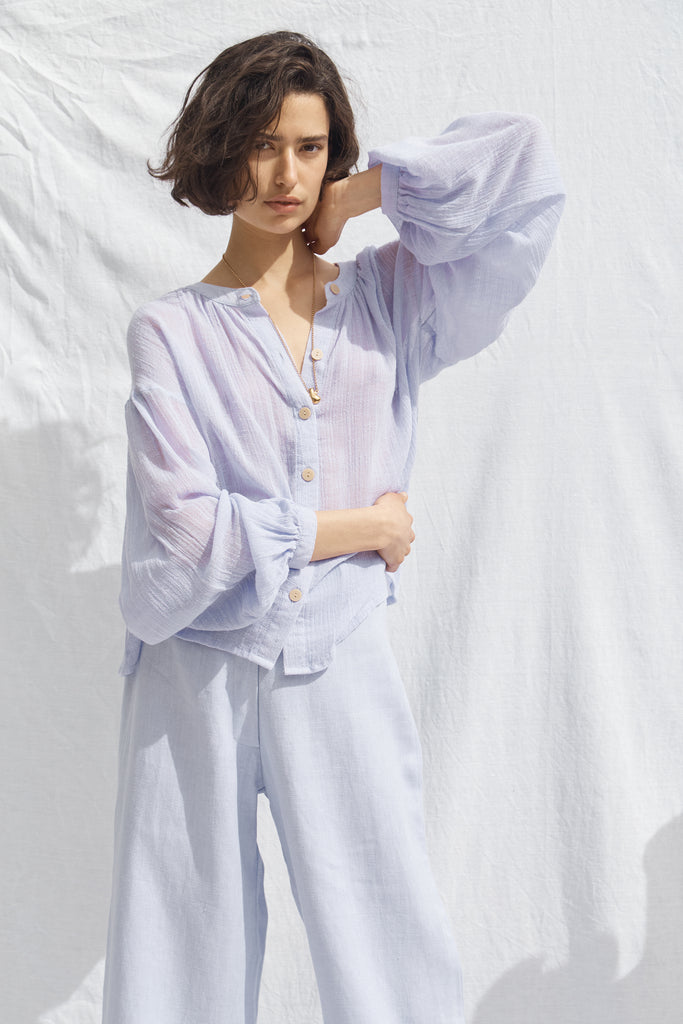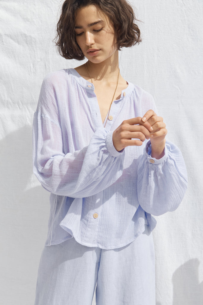 - Oversized billowy sleeve, front placket, hemmed cuff