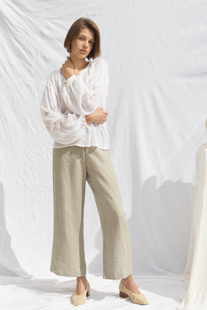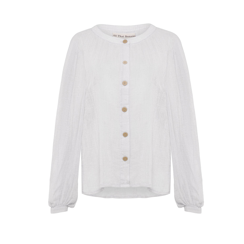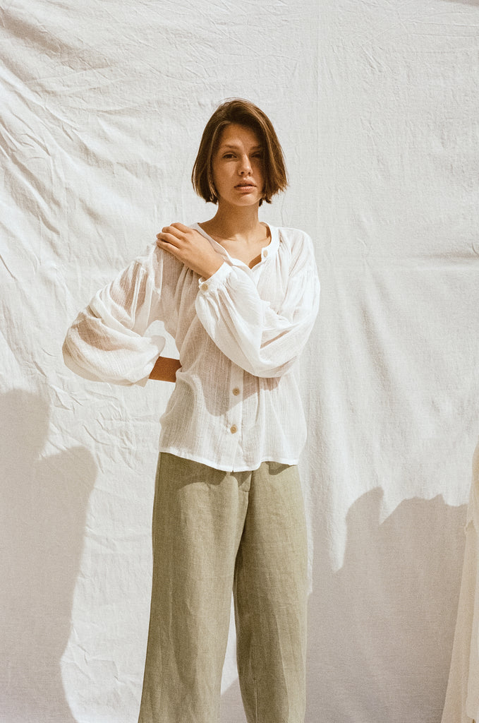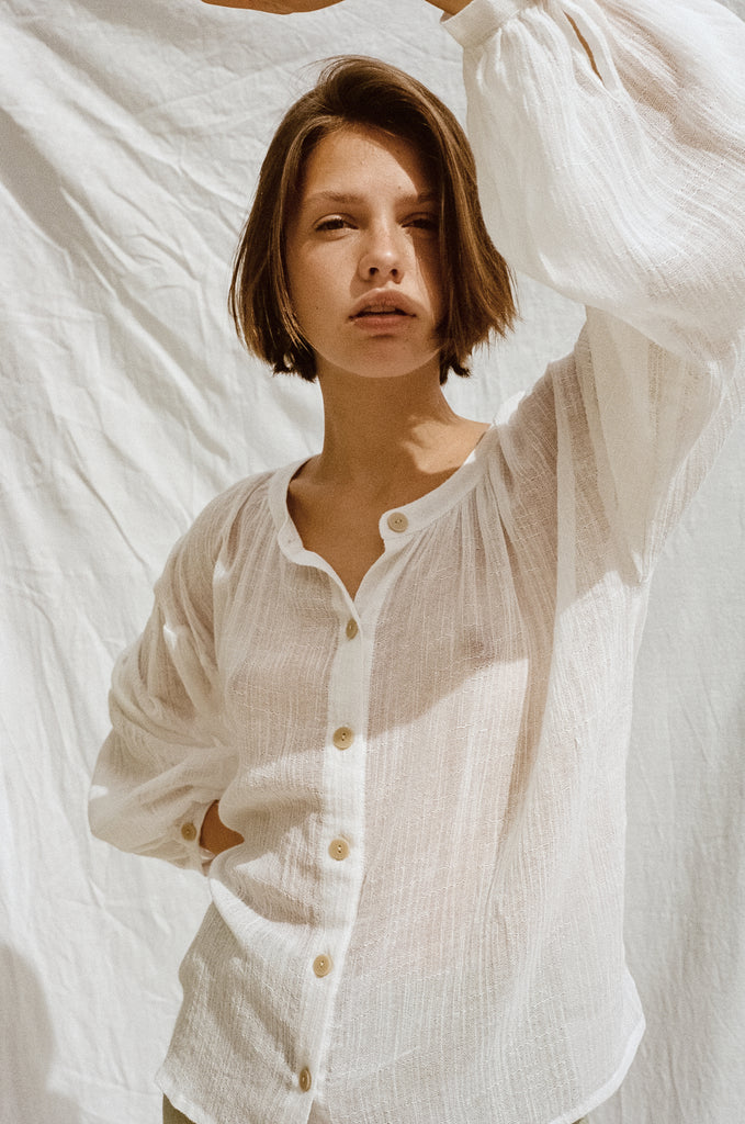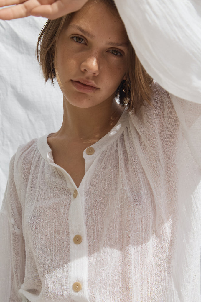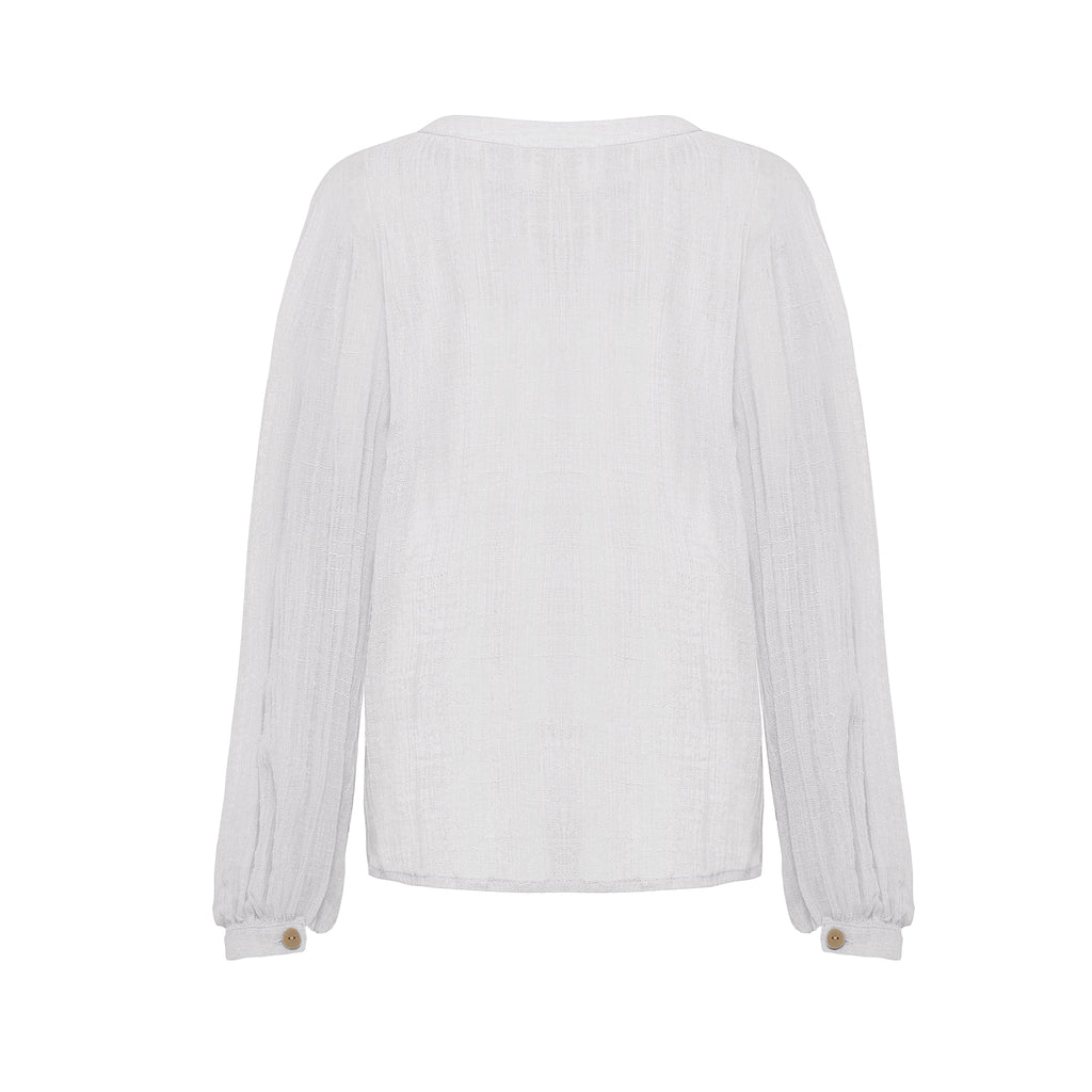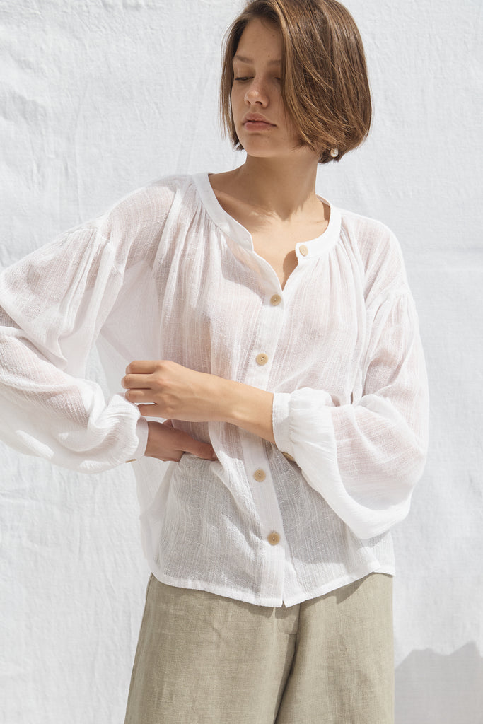 - Oversized billowy sleeve, front placket, hemmed cuff