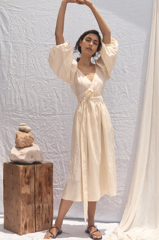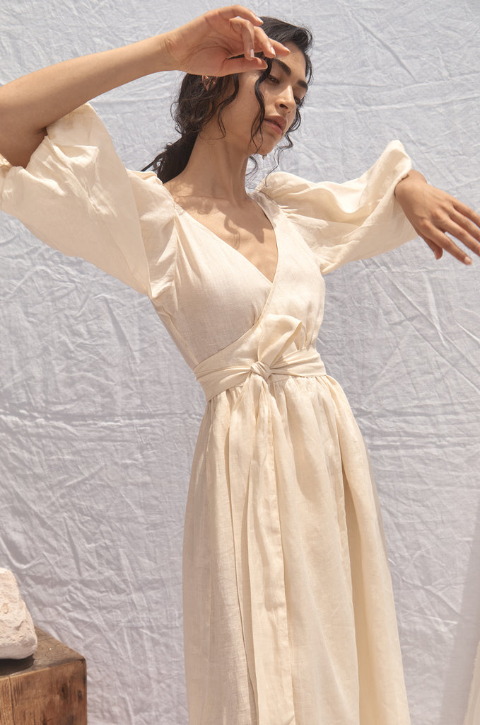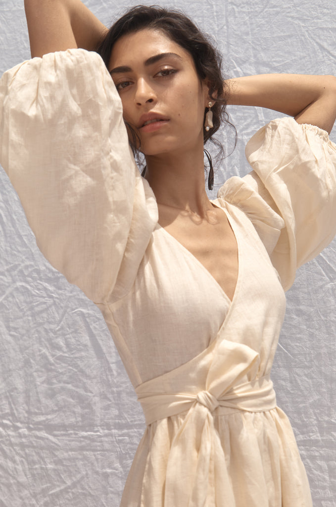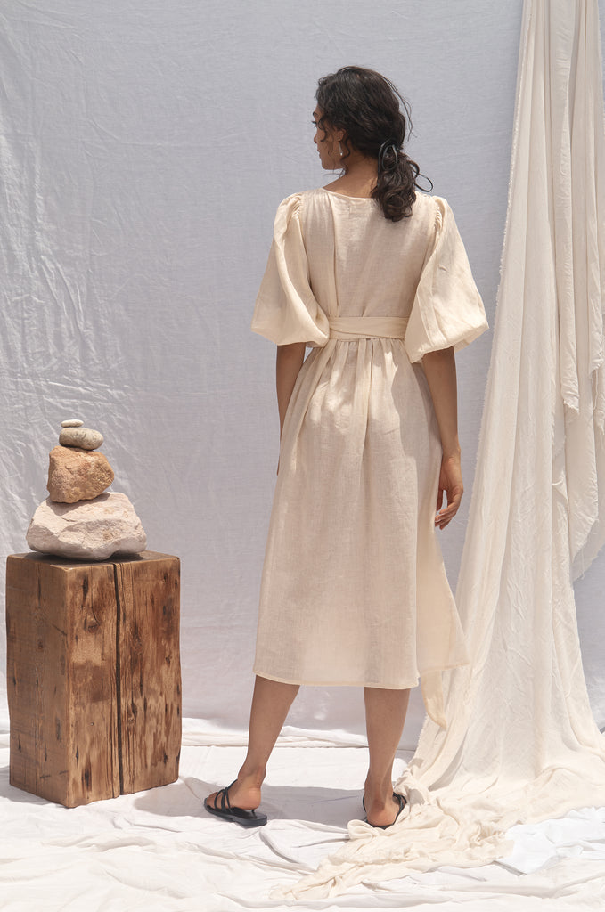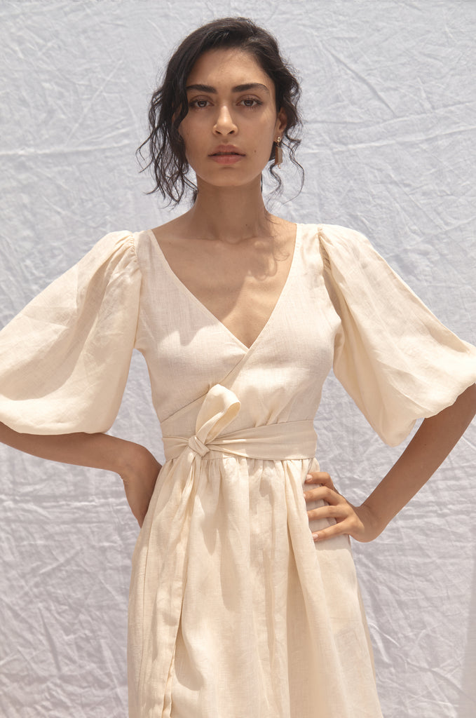 - Deep V neck, midi wrap Dress, oversized baloon sleeve.